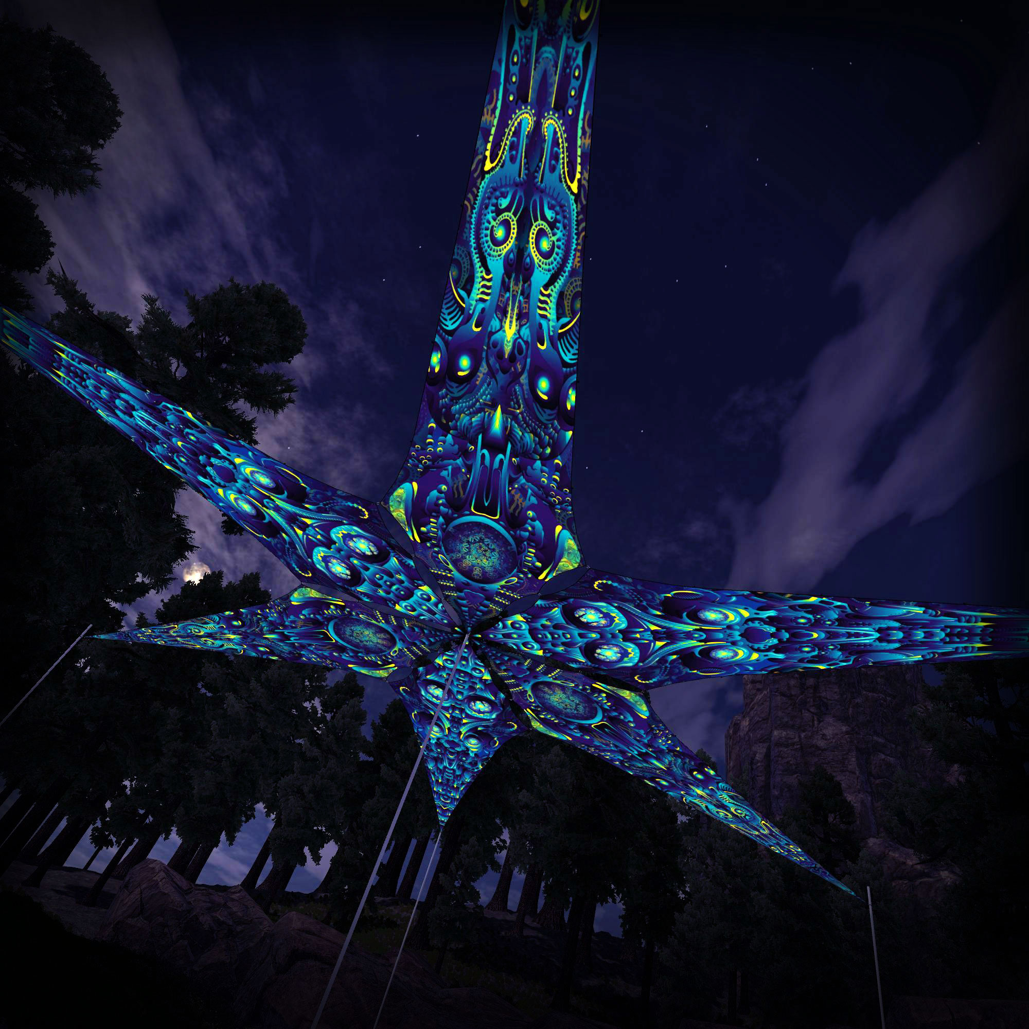 Chimera Protocol – Cyber-Nexus and Neuro-Hybrid – 6 Petals – Ceiling Decoration – Stretchable Fabric UV-Reactive Canopy