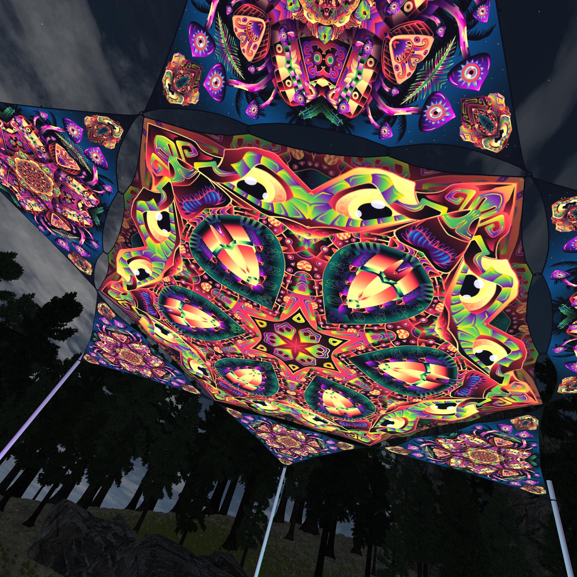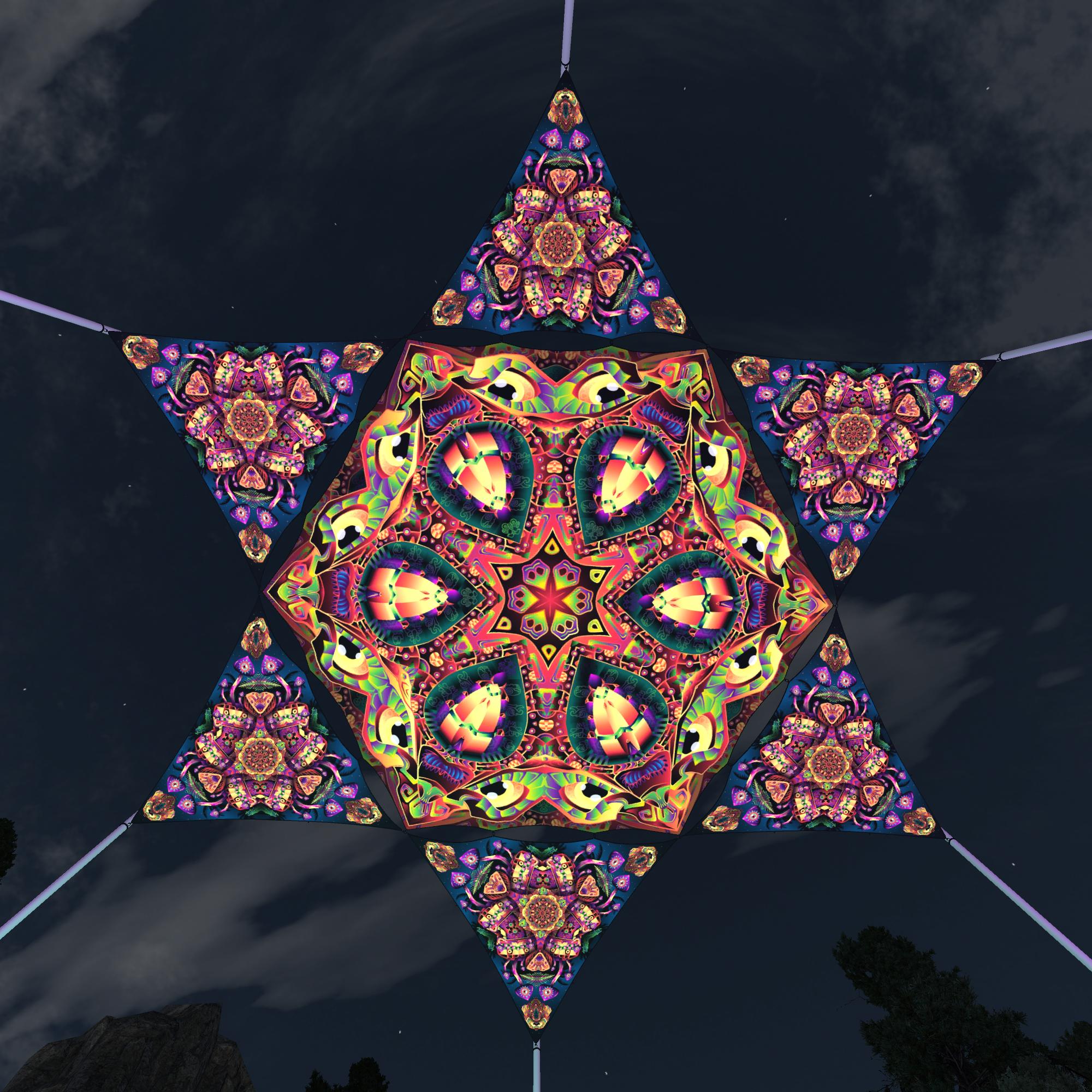 Fungal Rift – 1 Hexagon and 6 Diamonds – V12 – Ceiling Decoration – Stretchable Fabric UV-Reactive Canopy