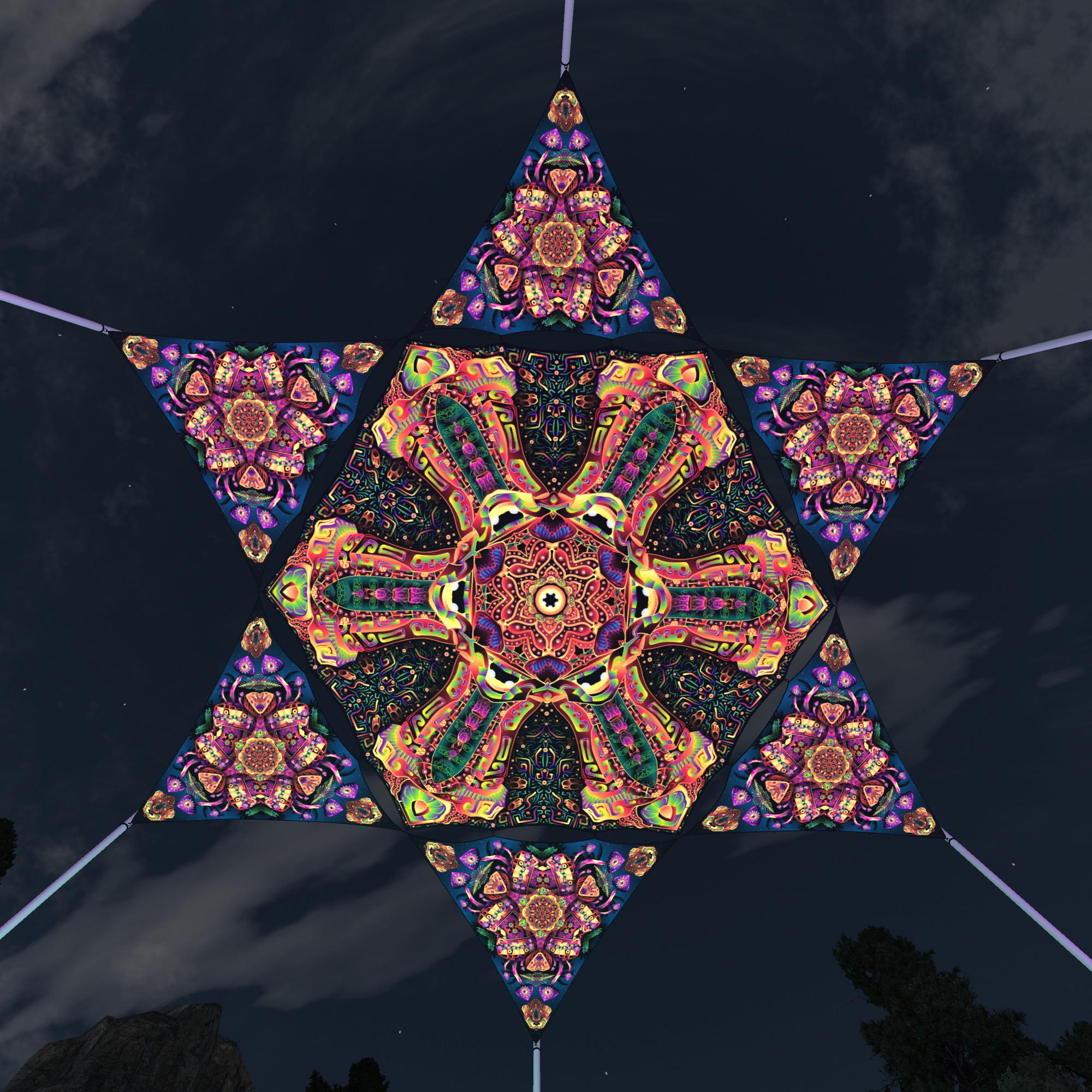 Fungal Rift – 1 Hexagon and 6 Diamonds – V8 – Ceiling Decoration – Stretchable Fabric UV-Reactive Canopy