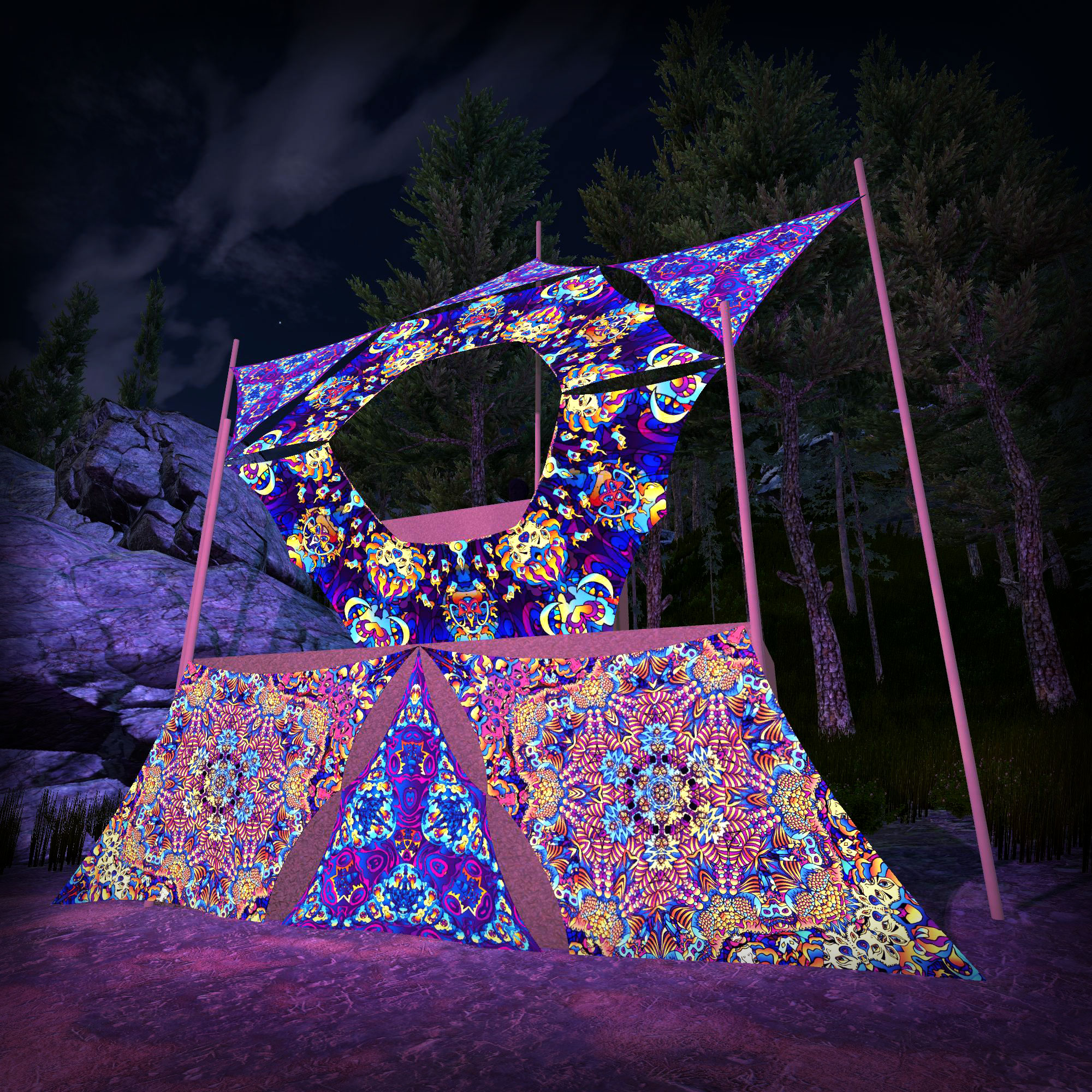 You can build multiple variants of DJ-Stages with this set. We are providing you with 5 layouts but you can surely come up with other ideas! All other canopy parts in this shop also have carabiners so it’s super-easy to connect them together to form beautiful trippy compositions.